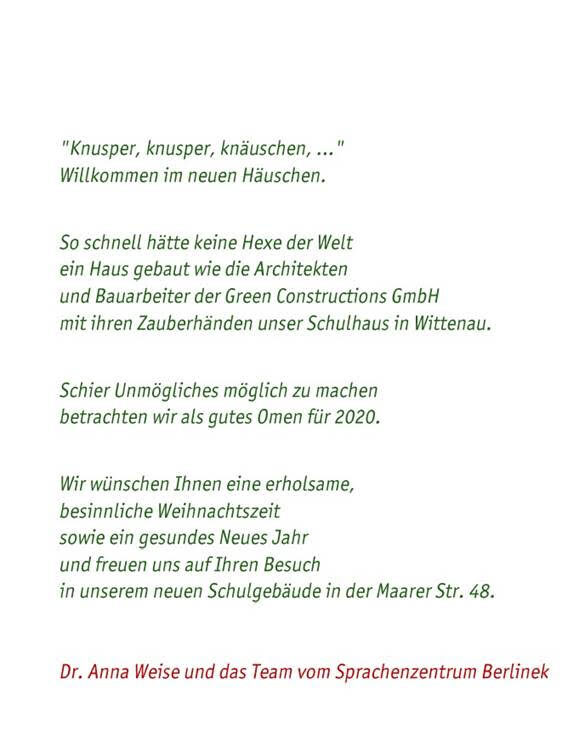 Am 23. Dezember verließ Berlinek die Unterrichtsräume in der Wallenroder Str. um nach einem halben Jahr ab Beginn der Baumaßnahme in das schöne neue Haus in der Maarer Str. 48 einzuziehen. Jetzt richten wir die Räumlichkeiten für euch ein und freuen uns auf euch ab dem 6. Januar 20!