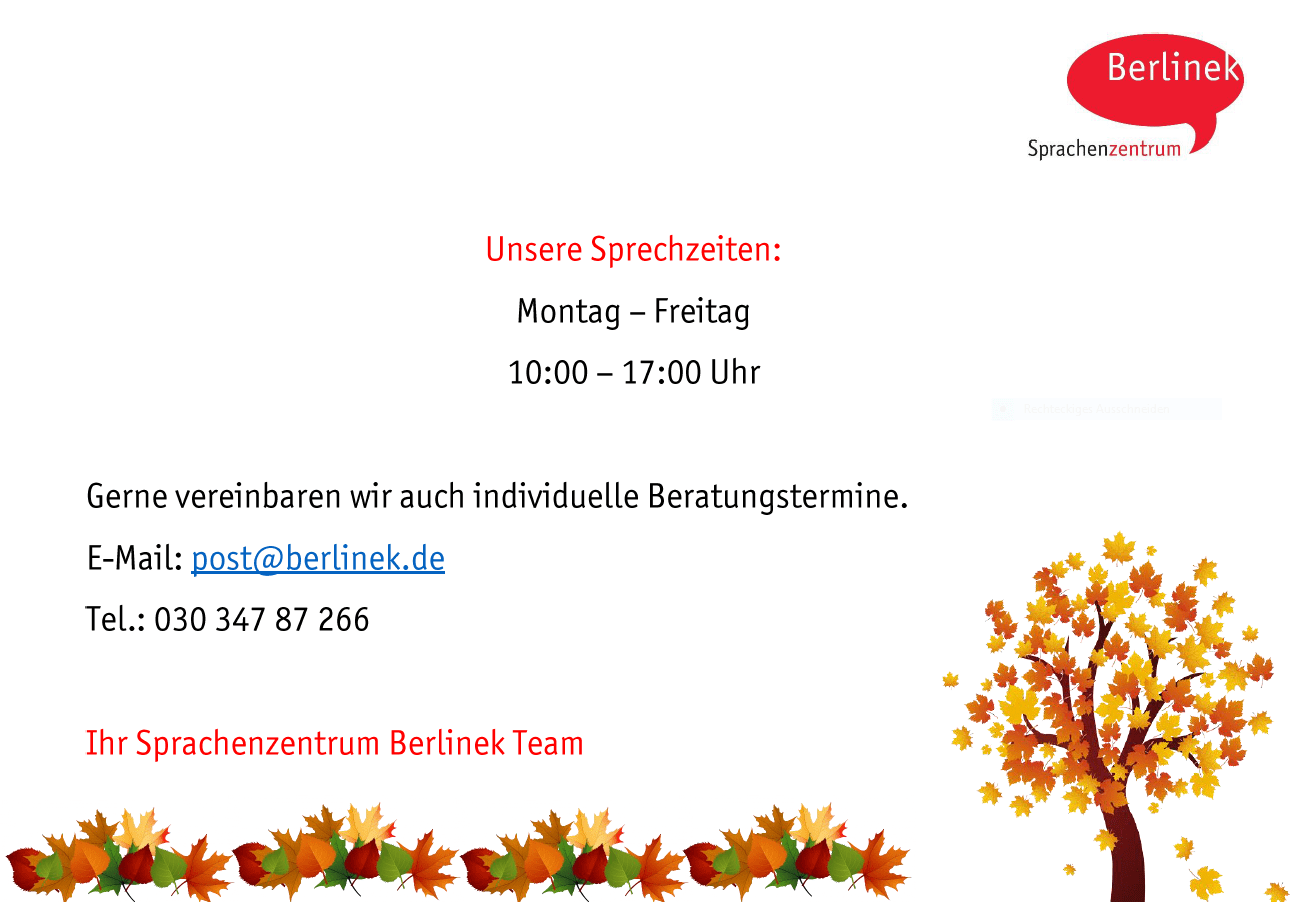 Unser Büro ist während der unterrichtsfreien Tage am Donnerstag und Dienstag jeweils von 10:00 bis 16:00 Uhr erreichbar.
