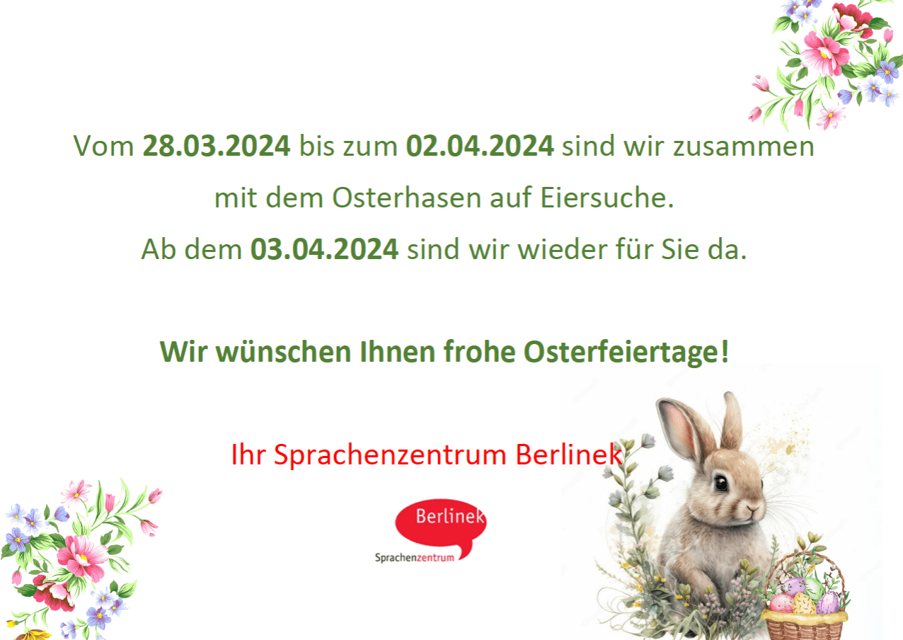 Von Donnerstag, den 17.04.25 bis Dienstag, den 22.04.25 findet kein Unterricht statt.