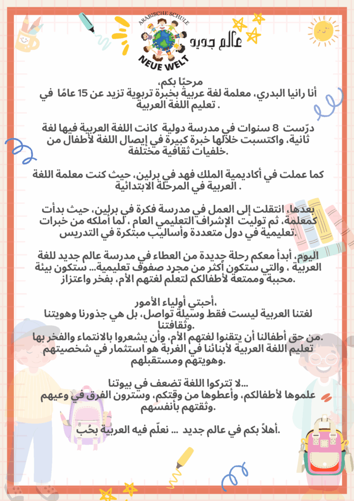 Wir wissen, wie wertvoll eine bilinguale Erziehung ist, daher öffnen wir gerne unsere Türen für die Arabischschule von Frau Rania Albadry und heißen alle Kinder und Jugendlichen in Berlineks Räumen willkommen.